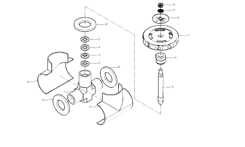 如圖2所示,本發(fā)明產(chǎn)品包括閥體1、主軸墊圈2、主軸密封件3和4、主軸5、主軸帽6、手柄7、真空絕緣殼體結(jié)構(gòu),由彈簧8、彈簧墊圈9和螺母10以及用于焊接的襯套11組成的基本阻隔流體結(jié)構(gòu), 用于真空釬焊的襯套 12 和真空外殼 13 輸了。主軸墊圈2、主軸密封件3和4、主軸5和主軸蓋6與閥體1組裝在一起,作為關(guān)閉流體的基本功能。)、彈簧墊圈(9)和螺母(10)組裝在一起,起到關(guān)閉流體的作用。將焊接襯套11和真空殼13通過(guò)一般氬焊等相互粘接,以確保一定的真空空間并支撐真空殼13,真空殼13和真空殼13在10-5托或更小的真空狀態(tài)下通過(guò)真空釬焊粘合,以保持閥體1和真空殼13之間的空間在真空狀態(tài)。真空箱形成的真空空間起到阻擋輻射熱和從外部傳遞的對(duì)流熱的作用。
